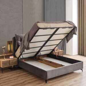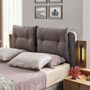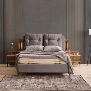 Le lit, équipé d’un sommier relevable avec système à pistons (4×4), intègre un espace de rangement discret et pratique, idéal pour optimiser l’espace sans compromettre l’esthétique. La tête de lit et son applique intégrée renforcent le caractère premium de l’ensemble, tandis que le système de port de charge USB apporte une touche de modernité parfaitement adaptée aux usages actuels.