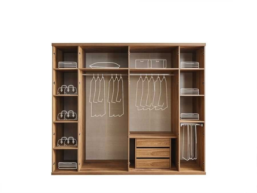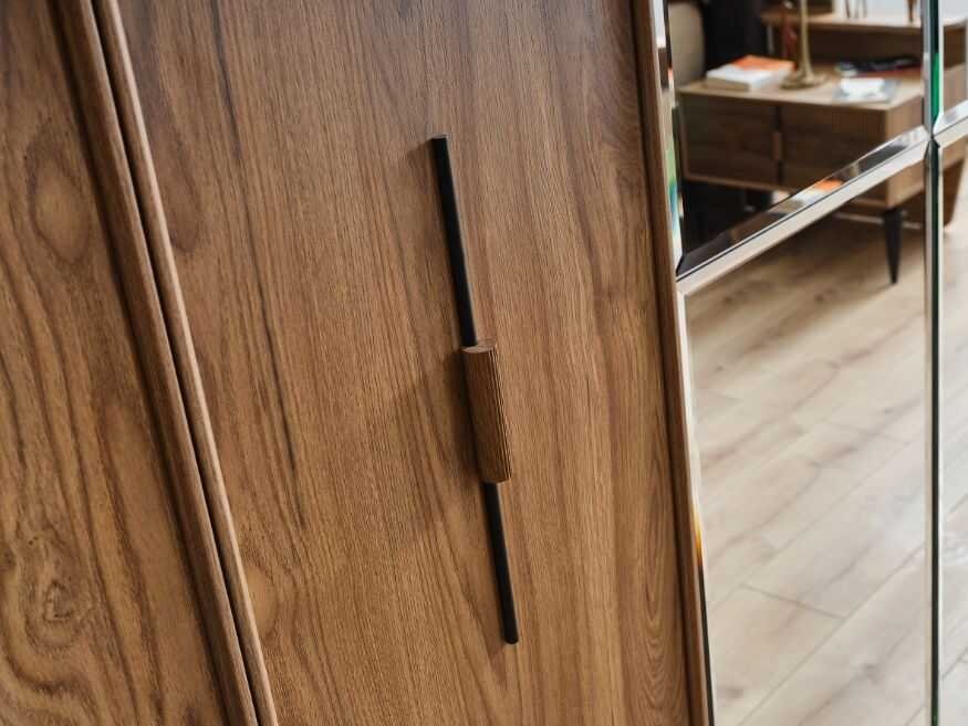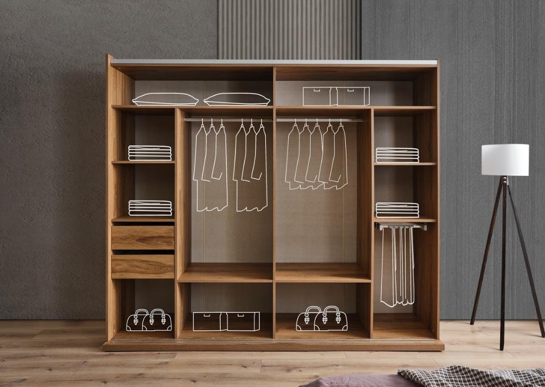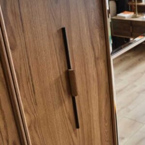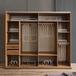 L’armoire, disponible en version classique ou coulissante, se distingue par son aménagement intérieur spacieux et fonctionnel. Les charnières à butée et le frein hydraulique sur les modèles coulissants assurent une ouverture et une fermeture fluides, silencieuses et confortables au quotidien.