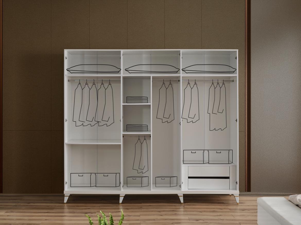 L’armoire à 6 portes, disponible également en version coulissante, se distingue par son volume généreux et son aménagement intérieur optimisé. Les charnières à butée et le frein hydraulique sur les modèles coulissants assurent une ouverture et une fermeture fluides, silencieuses et confortables.
