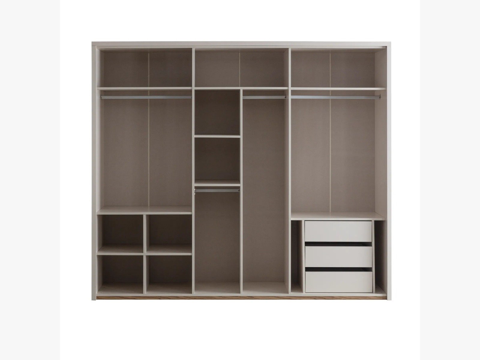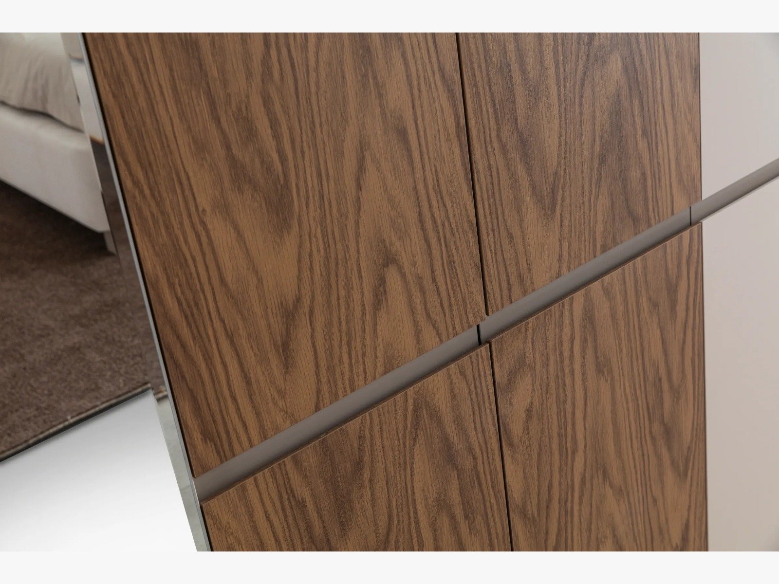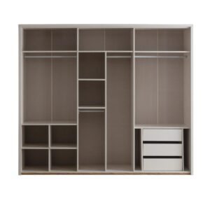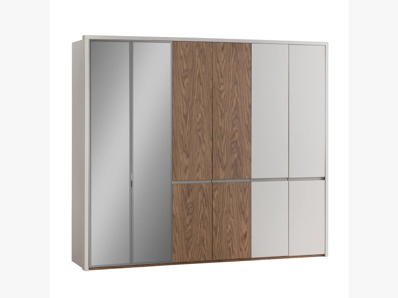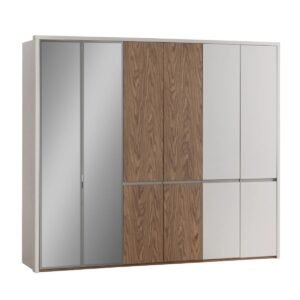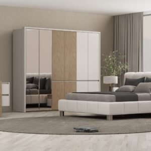 L’armoire spacieuse à 6 portes offre une organisation intérieure optimisée, facilitant le rangement quotidien. Grâce à ses charnières à butée, chaque ouverture et fermeture se fait en douceur et en silence, renforçant le confort d’utilisation.