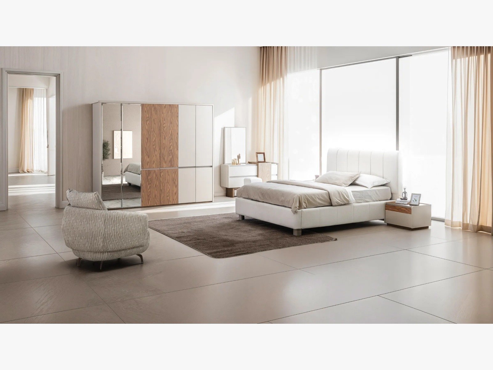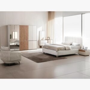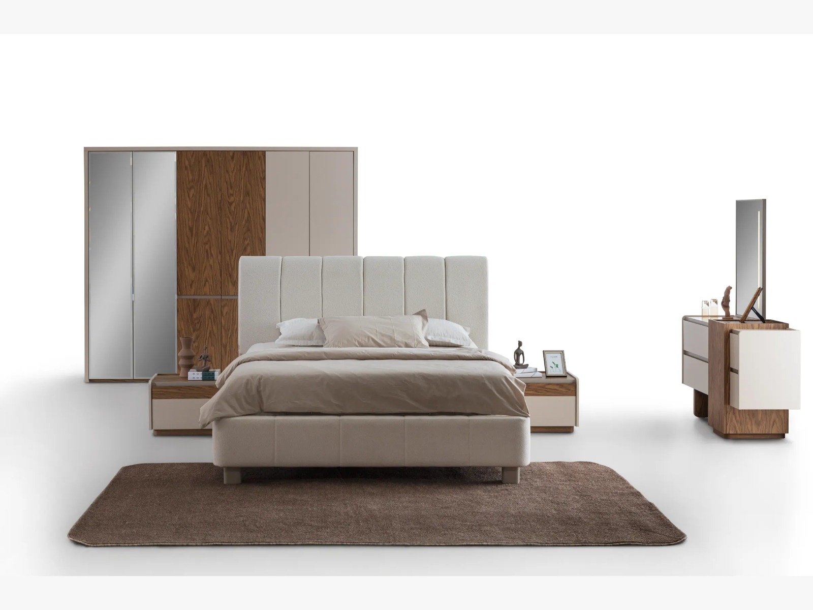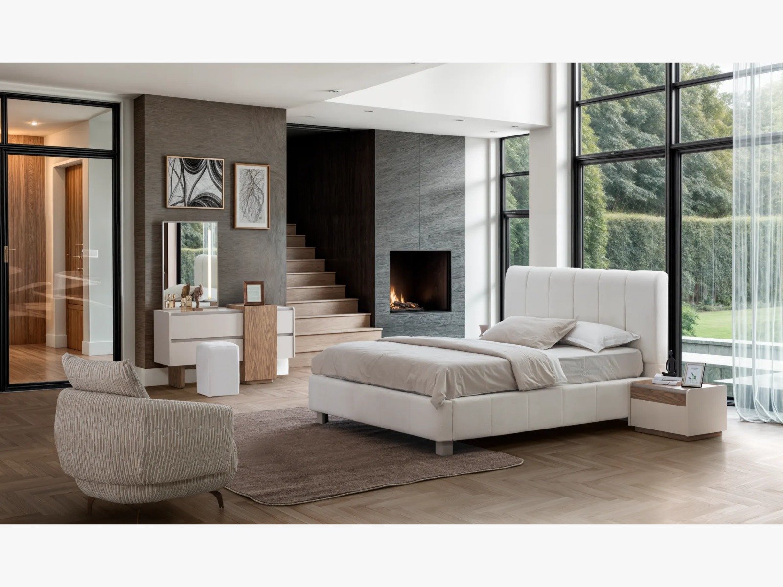 La commode, les tables de chevet, la coiffeuse et le miroir sur pied complètent harmonieusement l’ensemble pour créer une chambre parfaitement structurée, où esthétique et fonctionnalité cohabitent avec naturel.