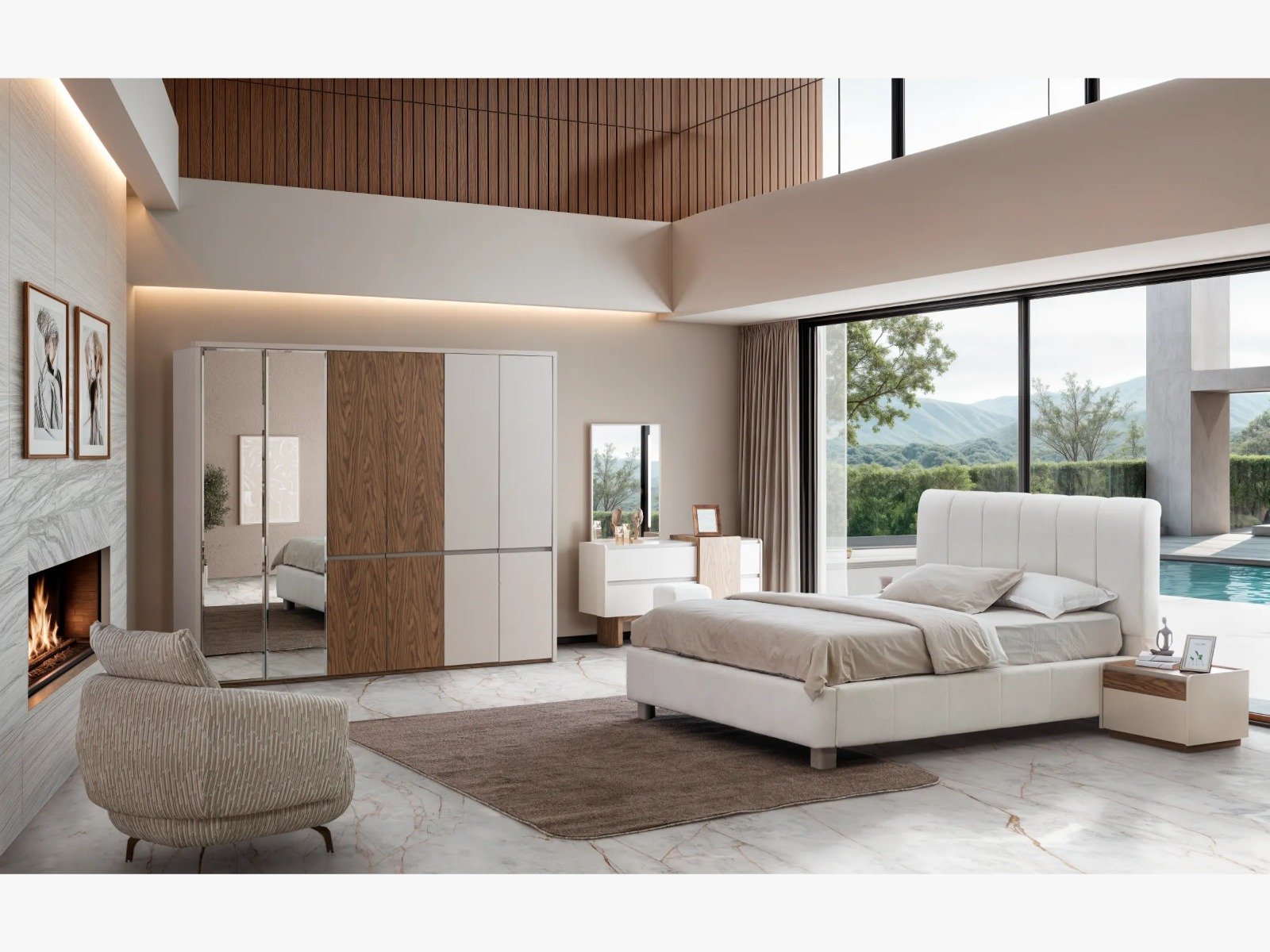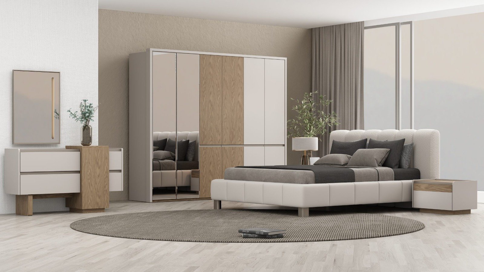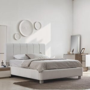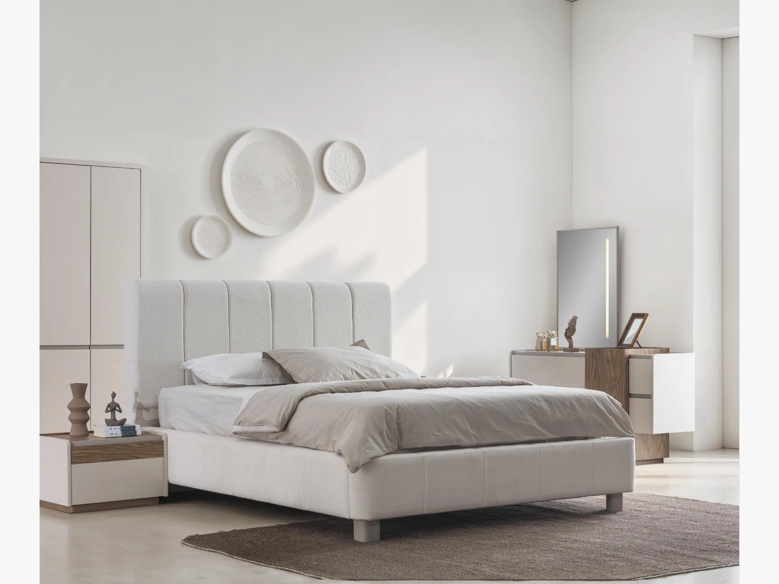 La commode, les tables de chevet, la coiffeuse et le miroir sur pied complètent harmonieusement l’ensemble pour créer une chambre parfaitement structurée, où esthétique et fonctionnalité cohabitent avec naturel.