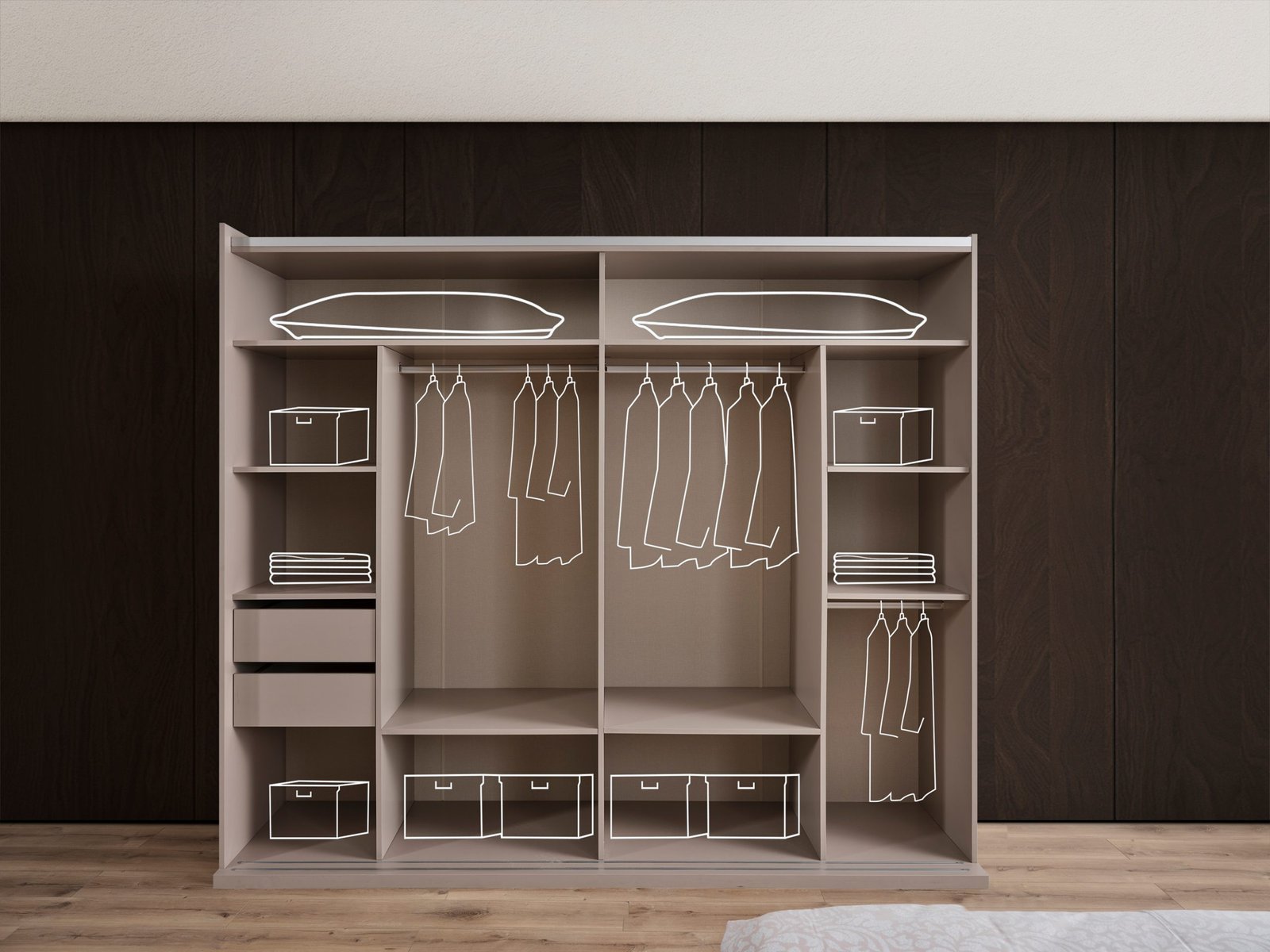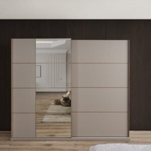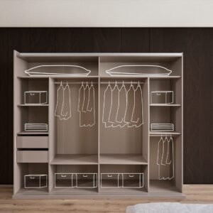 L’armoire coulissante, spacieuse et pratique, offre un aménagement intérieur optimisé pour organiser efficacement vos vêtements et accessoires. Les systèmes de charnières à butée et le frein hydraulique assurent une ouverture et une fermeture fluides, silencieuses et confortables au quotidien.