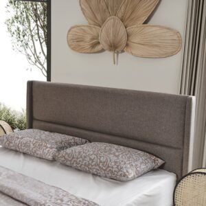 Le lit avec sommier relevable, équipé d’une base de coffre à pistons (4×4), intègre un espace de rangement discret et généreux, idéal pour optimiser l’espace tout en conservant une ligne esthétique épurée. La tête de lit, aux dimensions harmonieuses, complète l’ensemble avec élégance.